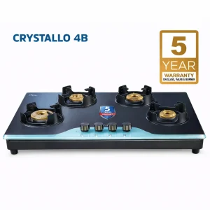 The Kutchina Crystallo 4 Burner Gas Stove comes with 8mm toughened glass, powerful brass burners, auto ignition and a sturdy MS body—ideal for large families and modern kitchens.