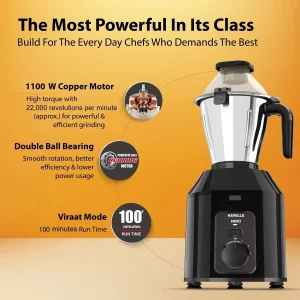 Havells Hexo Plus 1100W Mixer Grinder delivers powerful and efficient grinding with its heavy-duty motor and sturdy build. Equipped with 3 versatile jars, it ensures smooth blending, fine grinding, and reliable performance, making it perfect for everyday and tough kitchen tasks.