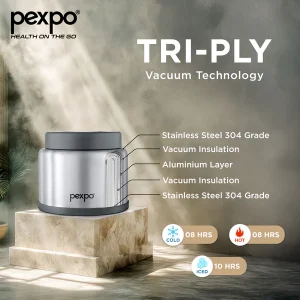 PEXPO Extreme Double Wall Lunch Box – a premium stainless steel lunch box with advanced double-wall insulation that keeps your food hot and fresh for hours. Durable, leak-proof, and stylishly designed for everyday use at work, school, or travel.