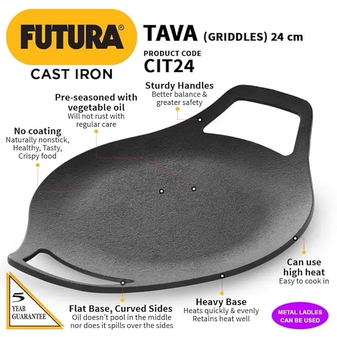 Cook authentic Indian breads and snacks with ease using the Hawkins Futura Cast Iron Tava 24cm (CIT24). Crafted from high-quality cast iron, this tava delivers superior heat retention and even heat distribution, ensuring soft rotis, crisp parathas, and evenly cooked dosas every time. Naturally non-stick when seasoned properly, it enhances flavor and promotes healthier cooking by adding trace amounts of iron to your food.