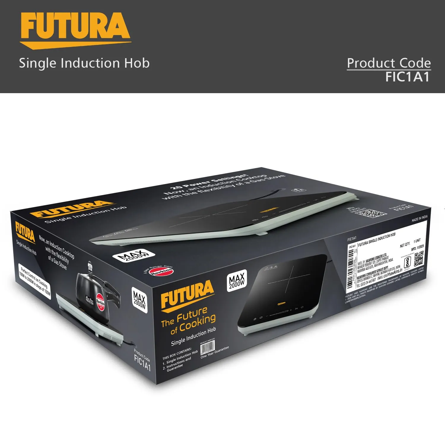 Hawkins Futura Single Hob Induction Cooktop 2000W (FIC1A1) | Fast, Safe & Energy Efficient Cooking | 1 Year Gaurantee