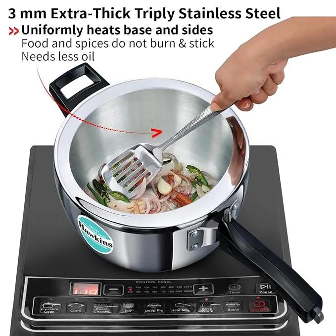 The Hawkins Triply Stainless Steel Pressure Cooker 3.5L Inner Lid (HSST35) is designed for superior performance, safety, and long-lasting durability. Its triply construction combines three layers — a food-grade stainless steel inner surface for healthy, non-reactive cooking, a high-quality aluminum core for rapid and even heat distribution, and a magnetic stainless steel outer layer that ensures excellent compatibility with induction cooktops.