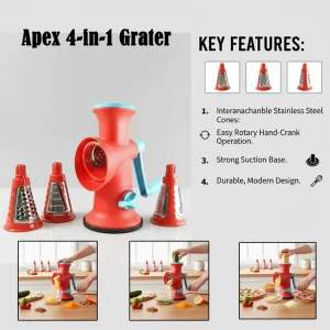 The APEX Signature 6-in-1 Rotary Grater & Potato Chipser is a versatile manual kitchen tool designed for fast, safe, and effortless food preparation. With interchangeable stainless steel blades, it easily grates cheese, vegetables, coconut, and slices potatoes into perfect chips, making everyday cooking quicker and more convenient.